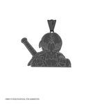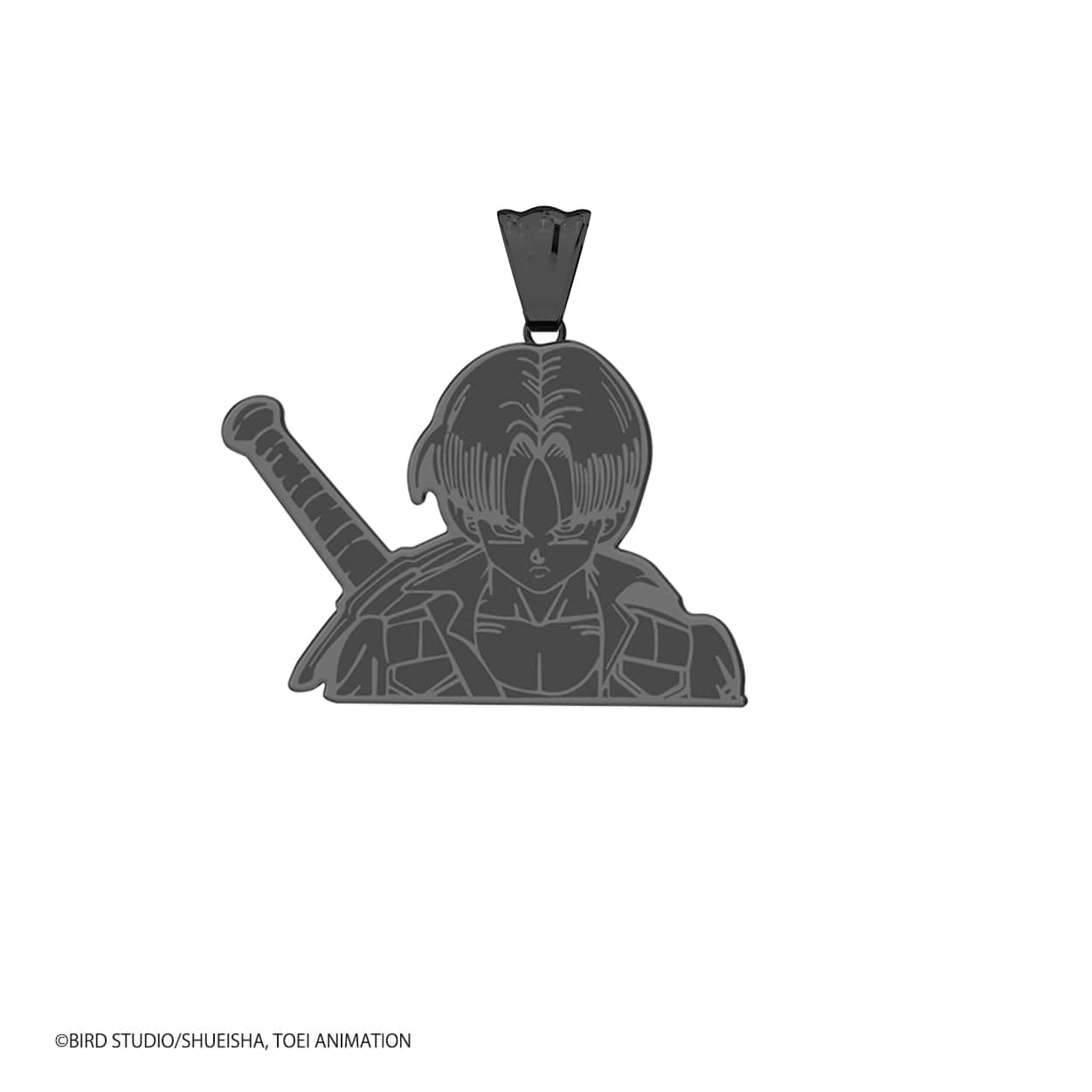 The Trunks Pendant features the bust of trunks and his sword and stands 30mm tall & 2mm at its thickest & 35mm wide.