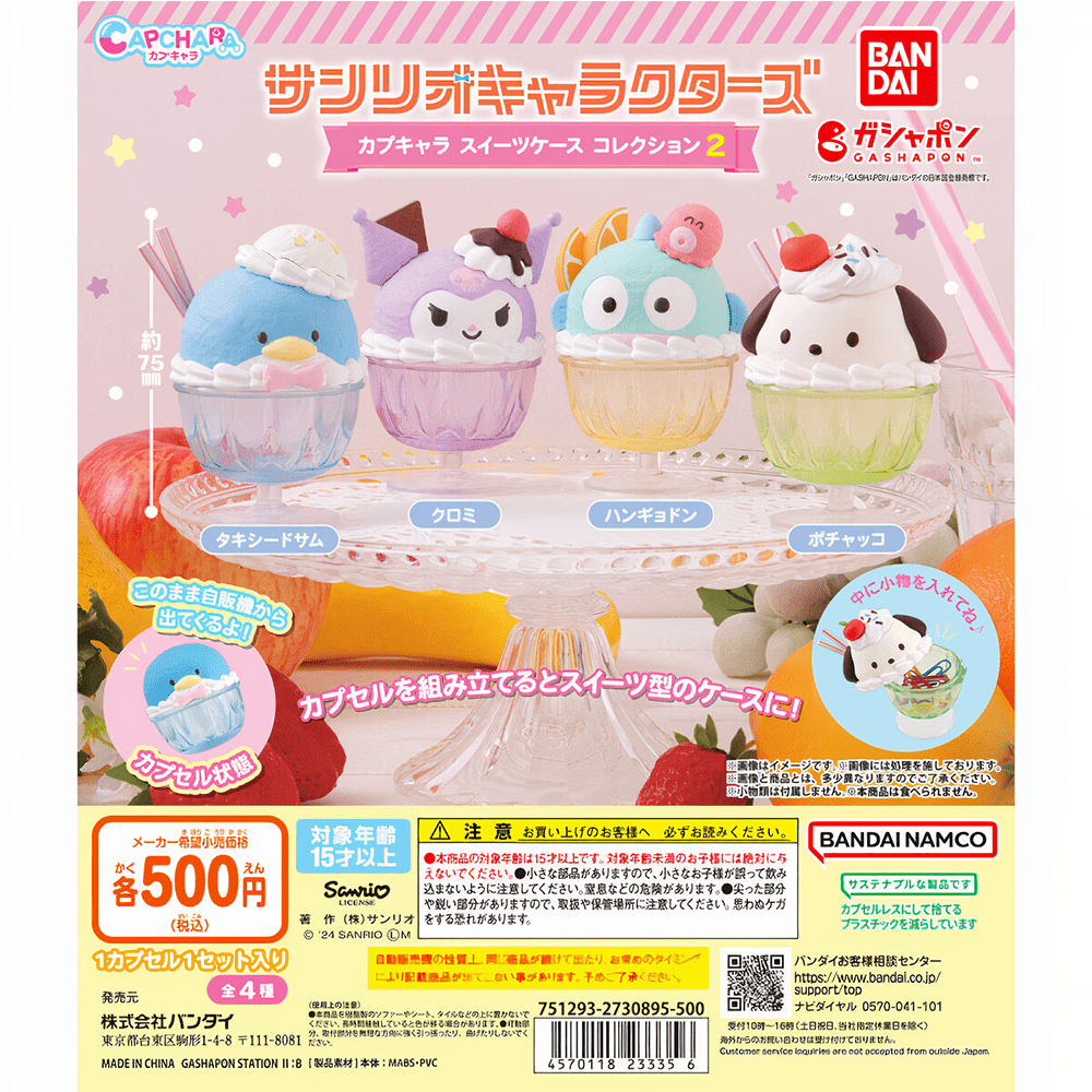 Indulge in the adorable charm of the Sanrio™ Capuchara Sweets Collection—a delightful gashapon series that combines your favorite Sanrio characters with irresistibly cute sweet treats! Each capsule contains a surprise figure featuring Kuromi, Tuxedo Sam, Pochacco, and more, transformed into delectable dessert-inspired designs.