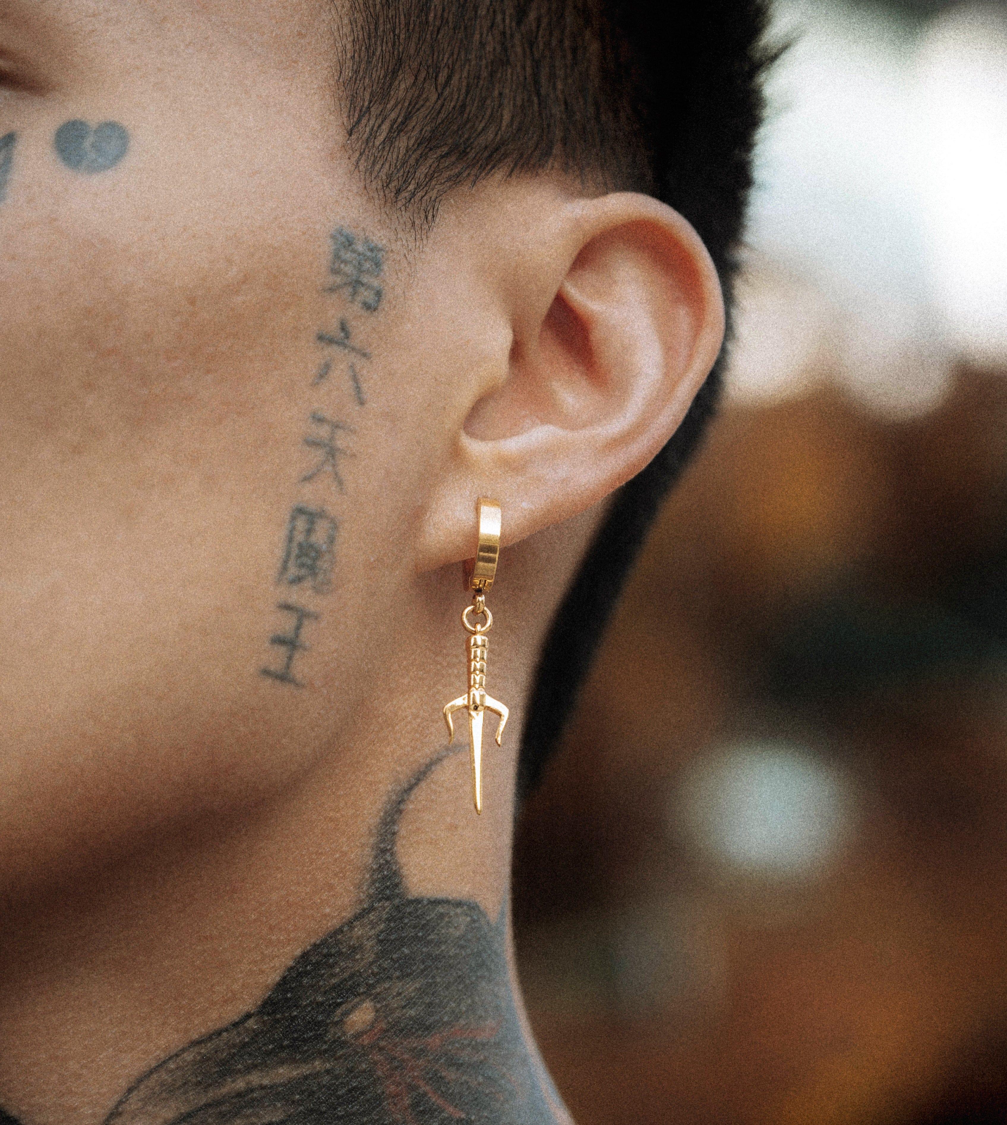 The Sai Earring has a hinged hoop earring (20 GA) and is made from high-grade Stainless Steel. Features a Japanese Sai knife design and stands 1" tall & 1/8" thick & 3/8" wide.