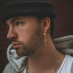 The Sword of Omens Earring has a hinged hoop earring (20 GA) and is made from high-grade Stainless Steel. At the hilt of the sword, the Eye of Thundera is hand-painted red. Features a sword design and stands 35mm tall & 2mm thick & 10mm wide.