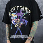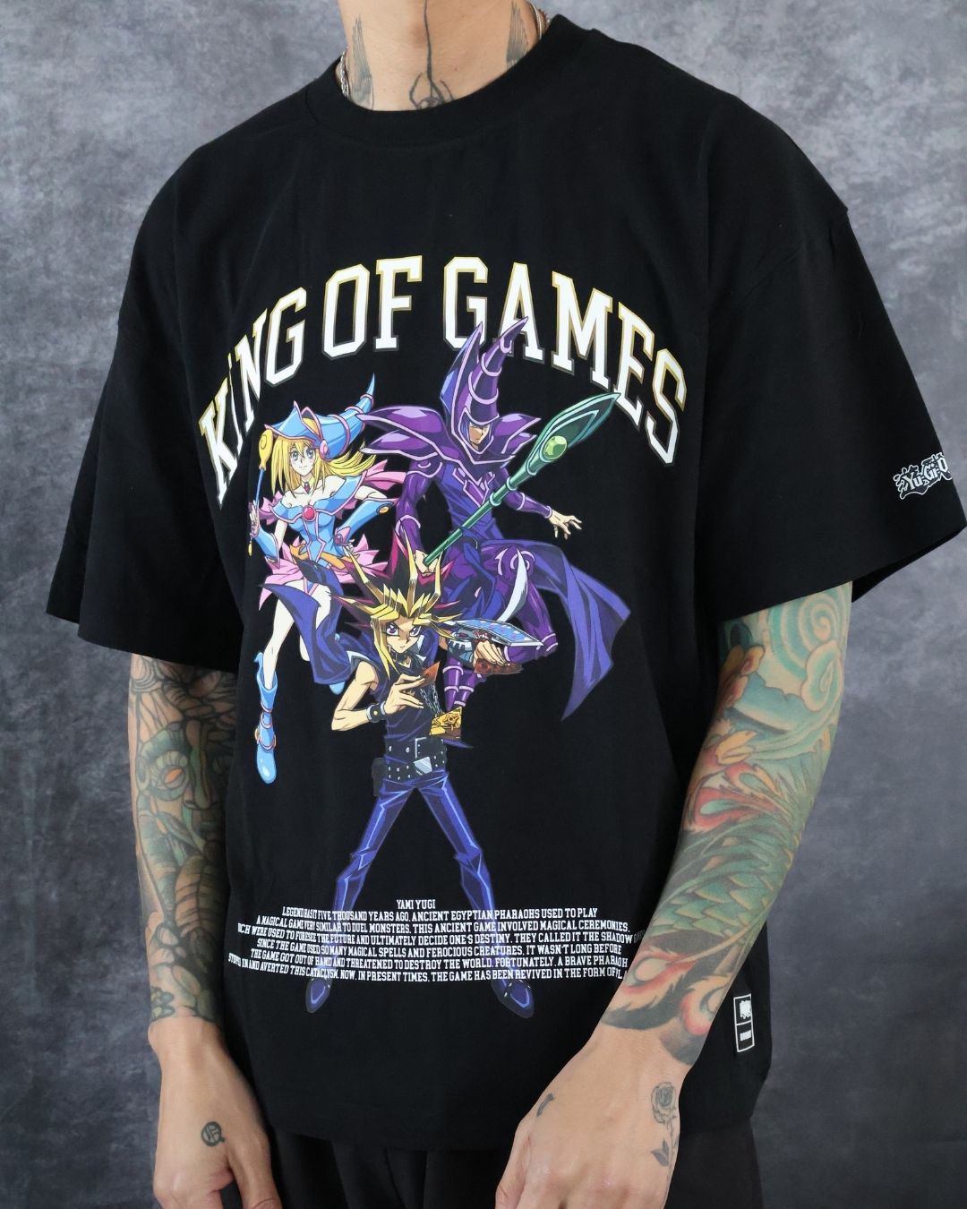 These t-shirts come in a cotton blend fabric with a straight hem in the oversized fit you know and love. The front features official artwork of Yami Yugi, Dark Magician and Dark Magician Girl with overlay text in a print on the front with rubber labels and text on both the front and back.