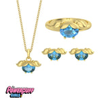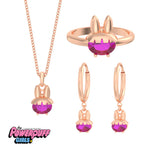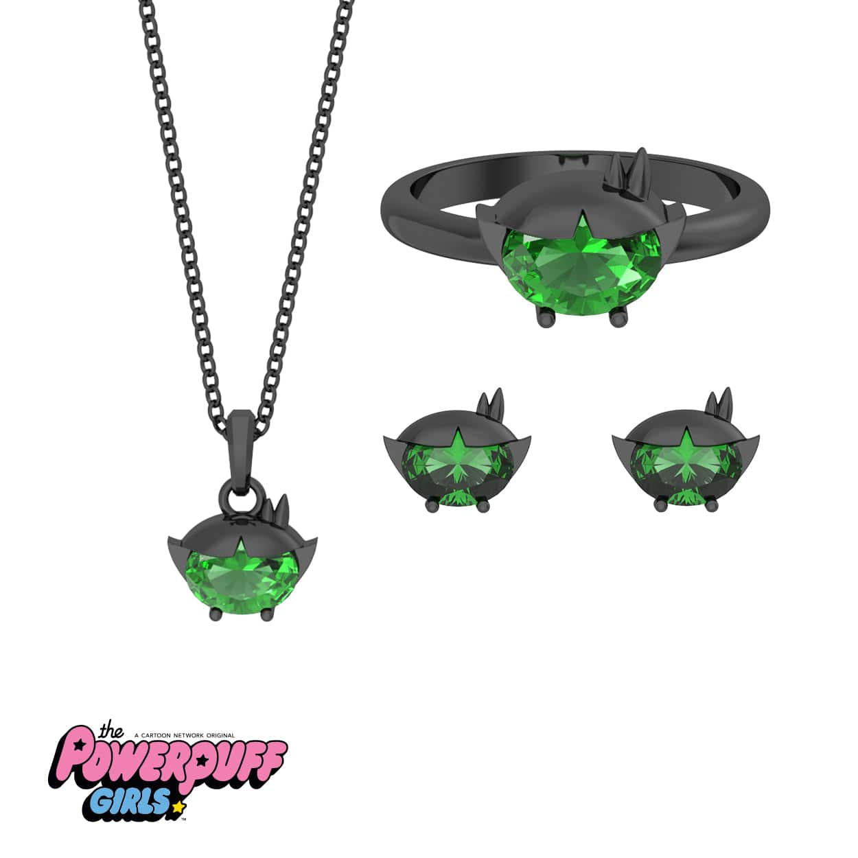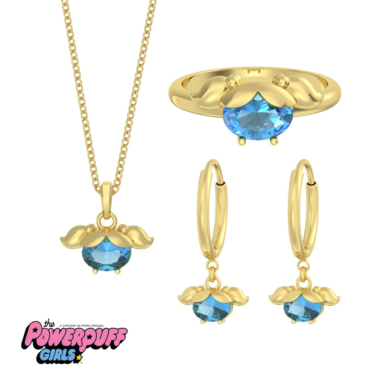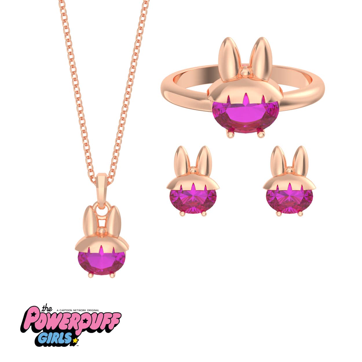 The Powerpuff Girls Gem Studs & Ring Set comes with a pair of earrings: stud or hoops, ring size of your choice, and pendant & chain.