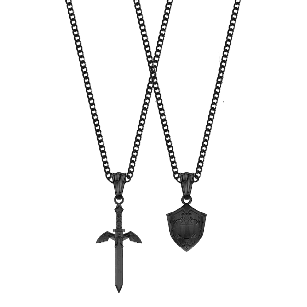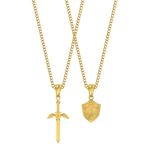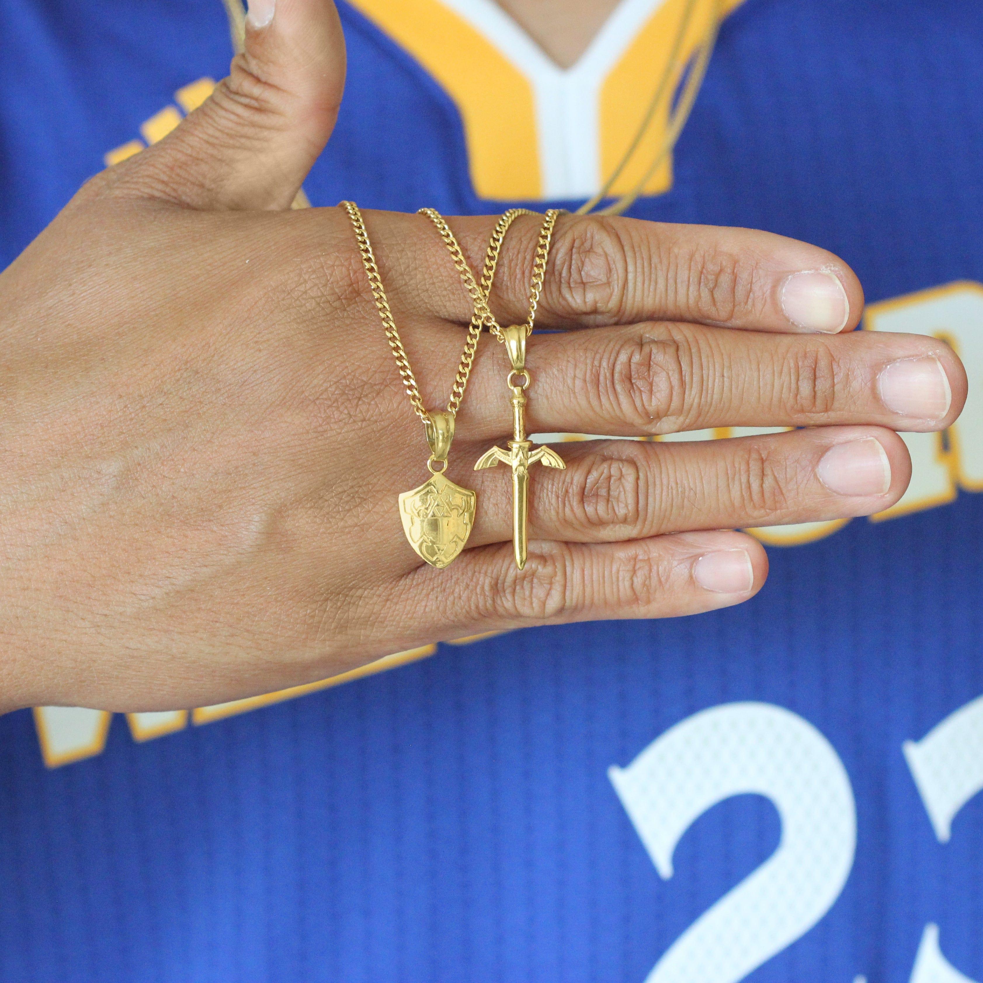 The Sword & Shield Necklace Comes With 2 Micro Curb Style Chain And The Chain Length Of Your Choice! The Pendant And Chain Are Made From High-Grade Stainless Steel. Features a sword and shield 3D style design with the sword standing at 35mm tall & 4mm thick & 16mm wide and the shield at 19mm tall, mm thick & 13mm wide.