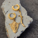 The Black Luster Soldier Earrings has a hinged hoop earring (20 GA) and is made from high-grade Stainless Steel. Features a 3D sword and/or shield design: sword stands 34mm tall & 3mm at its thickest & 10mm at its widest - shield stands 25mm tall & 2mm at its thickest & 20mm at its widest
