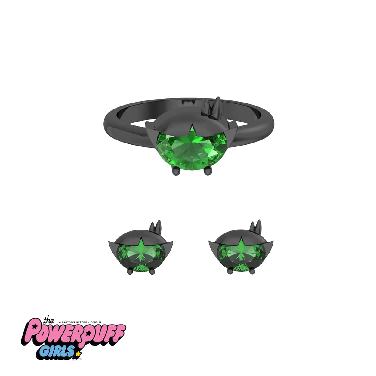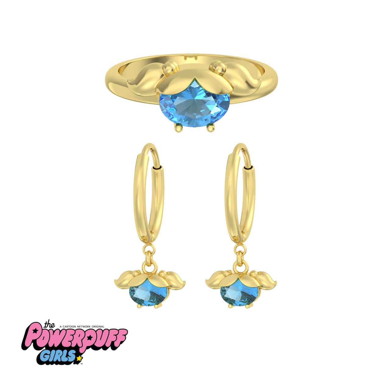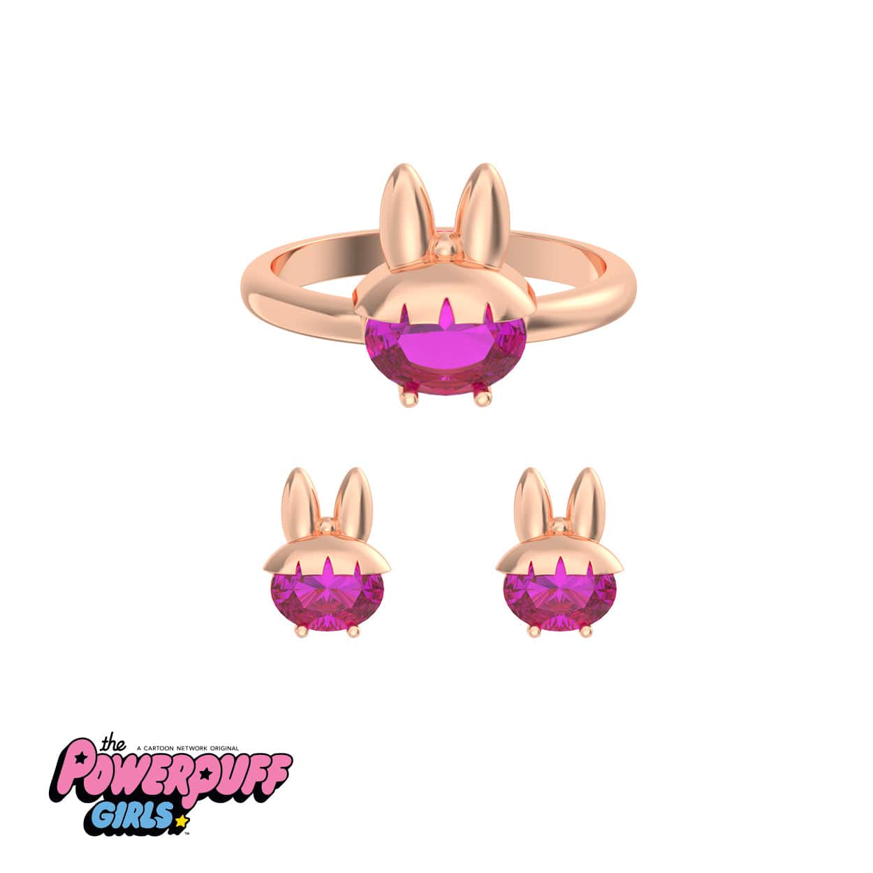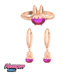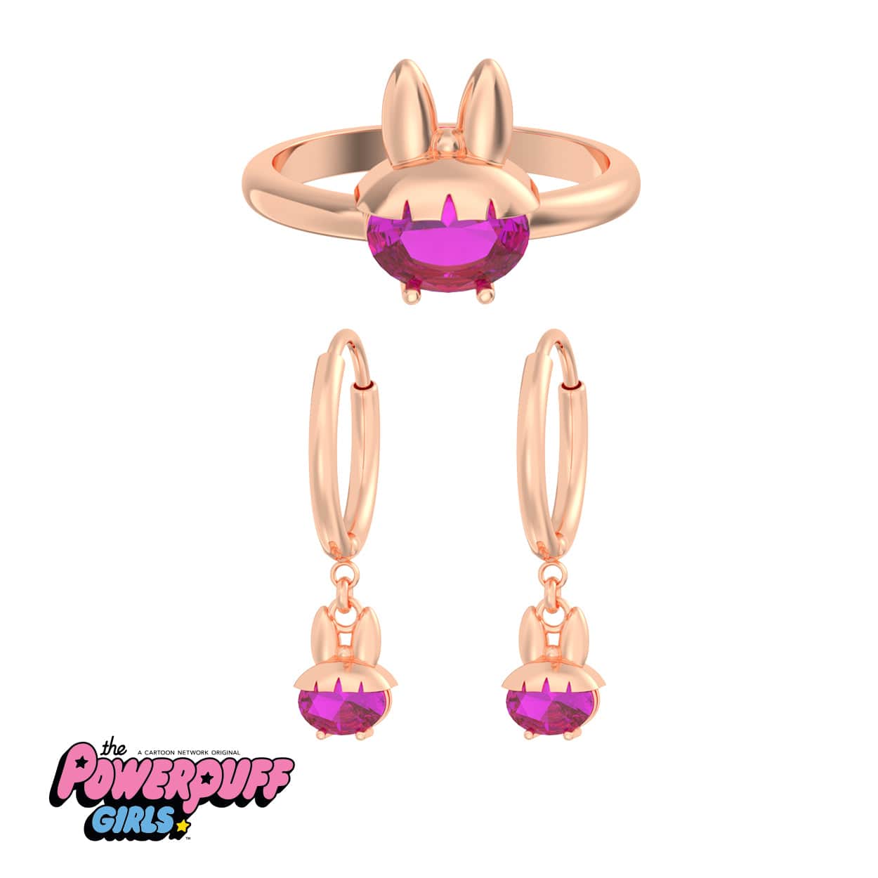 The Powerpuff Girls Gem Studs & Ring Set comes with a pair of stud or hoop earrings and a ring.