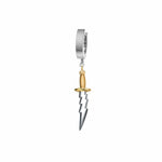 The Edge Earring has a hinged hoop earring (20 GA) and is made from high-grade Stainless Steel. Features a 2 tone jagged dagger design and stands 1 1/4" tall & 1/4" thick & 1/2" wide.