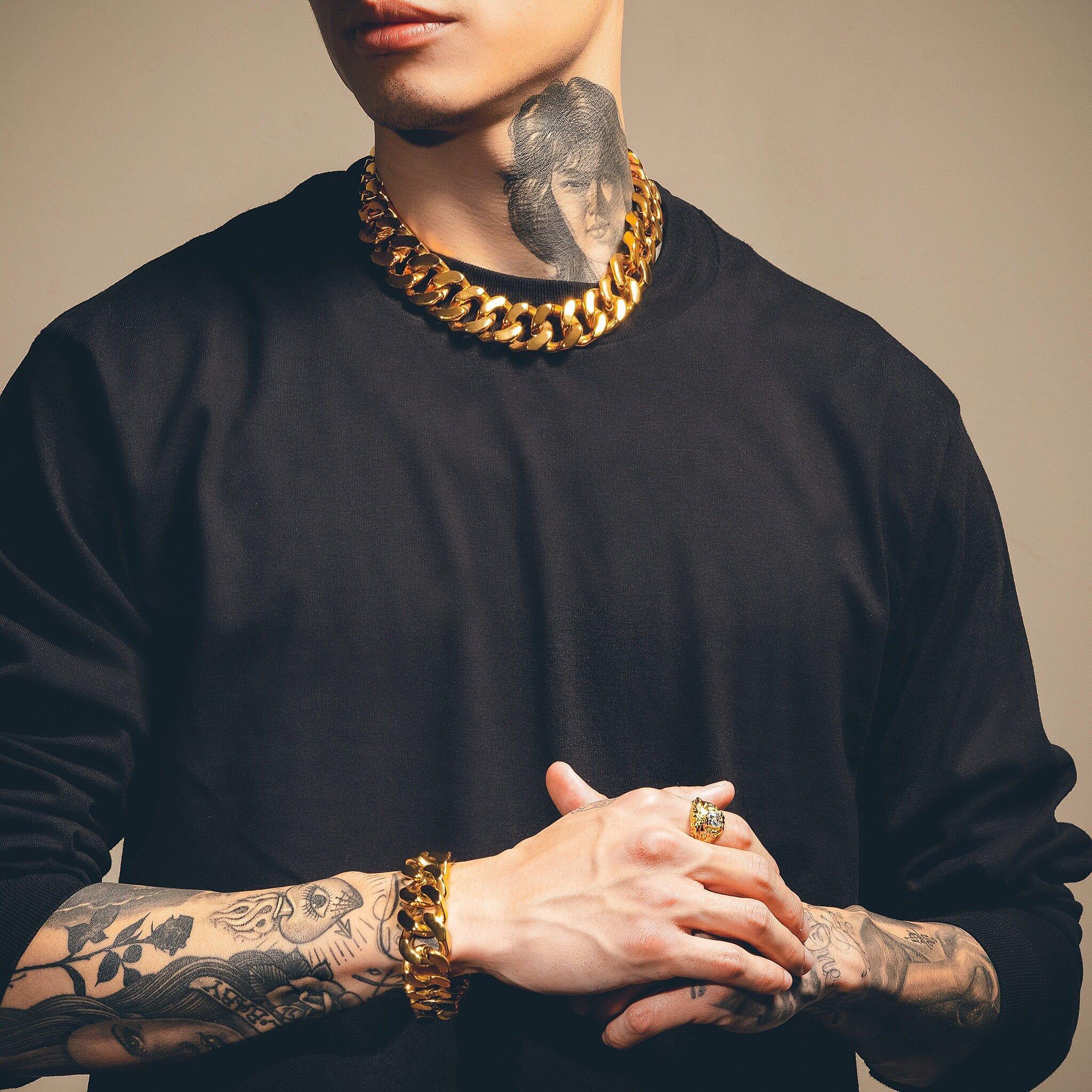 Features 20mm wide chunky curb links, double trigger clasp and finished with an Ion Bonding technique for long-lasting durability and shine.