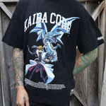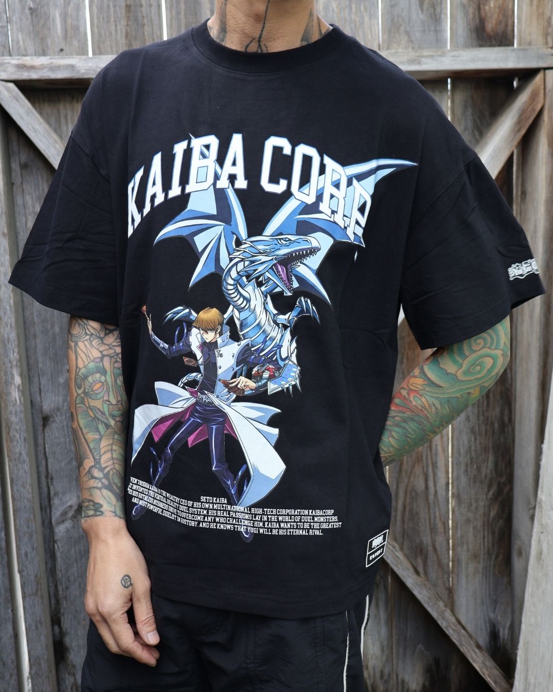 These t-shirts come in a cotton blend fabric with a straight hem in the oversized fit you know and love. The front features official artwork of Seto Kabai and his Blue Eyes White Dragon with overlay text in a print on the front with rubber labels and text on both the front and back.
