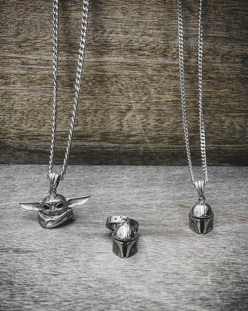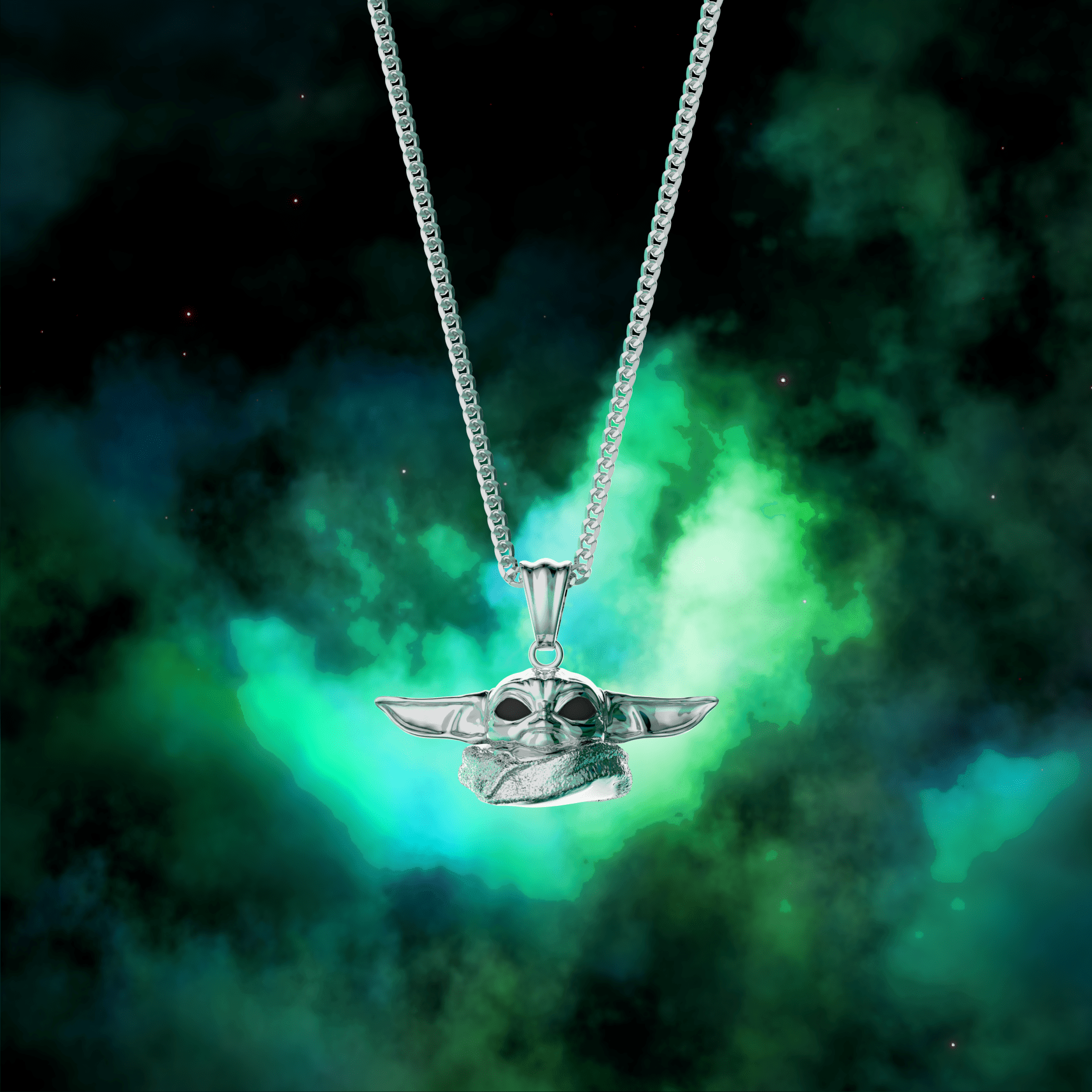 eatures A 3D Style Grogu Bust That Stands 1/2" Tall & 7/8" Wide & Star Wars Logo Pendant At 1/2" Tall X 1/4" Wide.