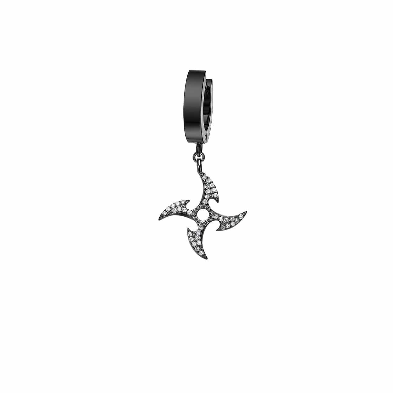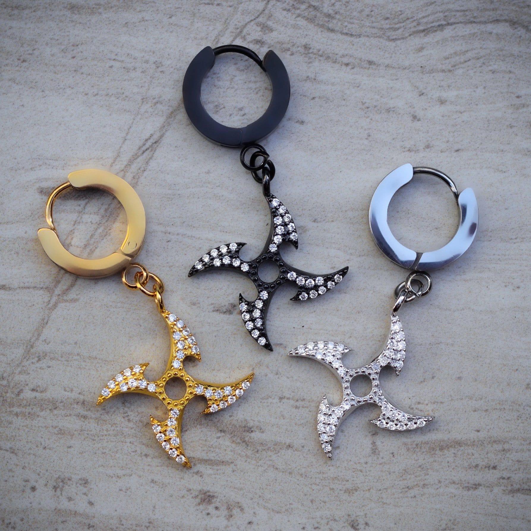 The Stone Senshi Earring has a hinged hoop earring (20 GA) and is made from high-grade Stainless Steel. Features a Japanese ninja star design and stands 20mm tall & 3mm thick & 20mm wide.