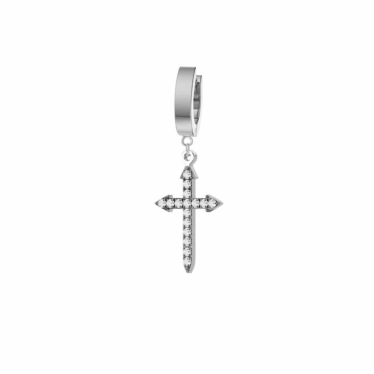 The Gem Cros Earring has a hinged hoop earring (20 GA) and is made from high-grade Stainless Steel. Features a cross charm, 1" tall.
